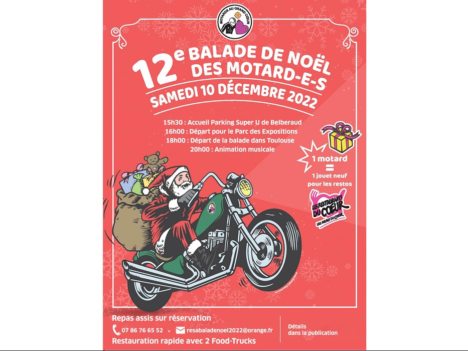 2 - Apporter directement des jouets neufs et non emballés au Parc des Expositions (ou au départ de notre agence de Belberaud) et participer avec sa moto à la 12ème balade de Noël des motard-e-s. Le déguisement en Père-Noël ou Mère-Noël est vivement conseillé !